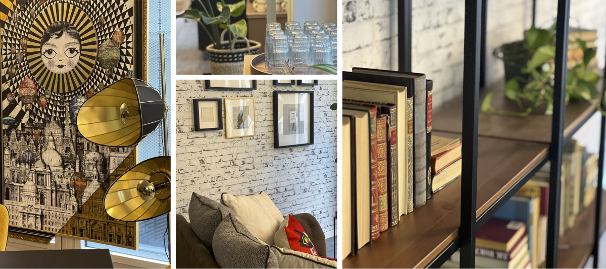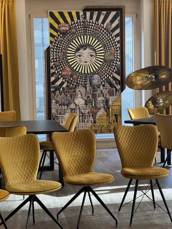 Unser Raum BLACK CAT wurde mit Liebe zum Detail gestaltet, um eine einzigartige Atmosphäre zu schaffen, die sowohl die literarische Vorlage als auch moderne Eleganz widerspiegelt. Der Raum verfügt über 8 Tische mit bequemen gelben Polsterstühlen und eine gemütliche Loungeecke, die eine flexible Nutzung ermöglicht. Jedes Detail im BLACK CAT erinnert an die magischen Elemente von "Der Meister und Margarita". Von Büchern bis hin zur Dekoration, die die elegant düstere Stimmung des Romans aufgreifen – der Raum ist eine Hommage an das literarische Meisterwerk von Mikhail Bulgakov.